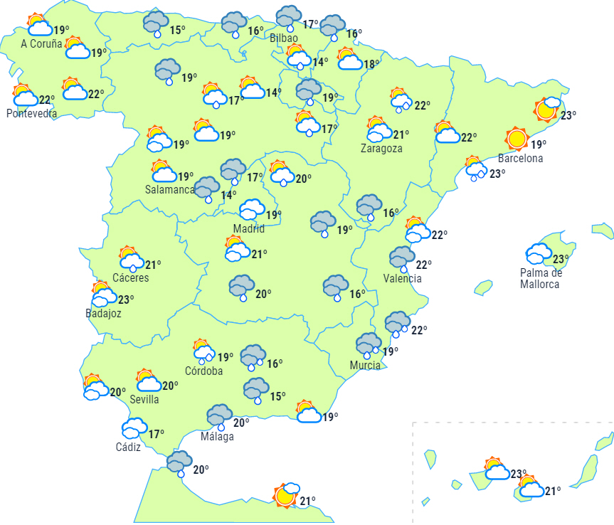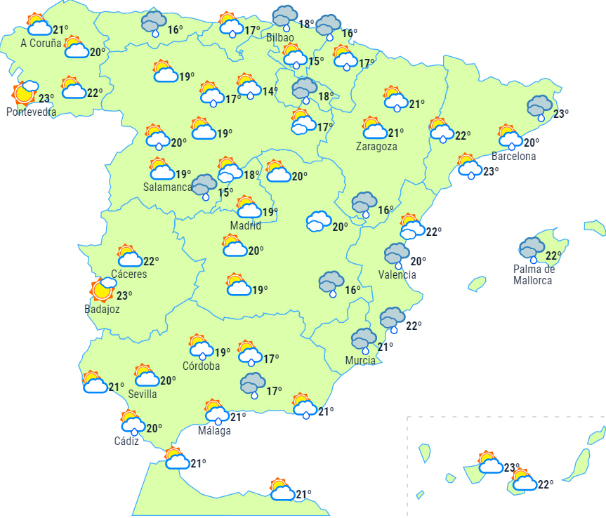 Overskyet i perioder over resten af halvøen og Balearerne med sandsynlighed for byger og spredte tordenbyger, som lokalt vil være kraftige i dele af det nordlige Aragón og Catalonien.