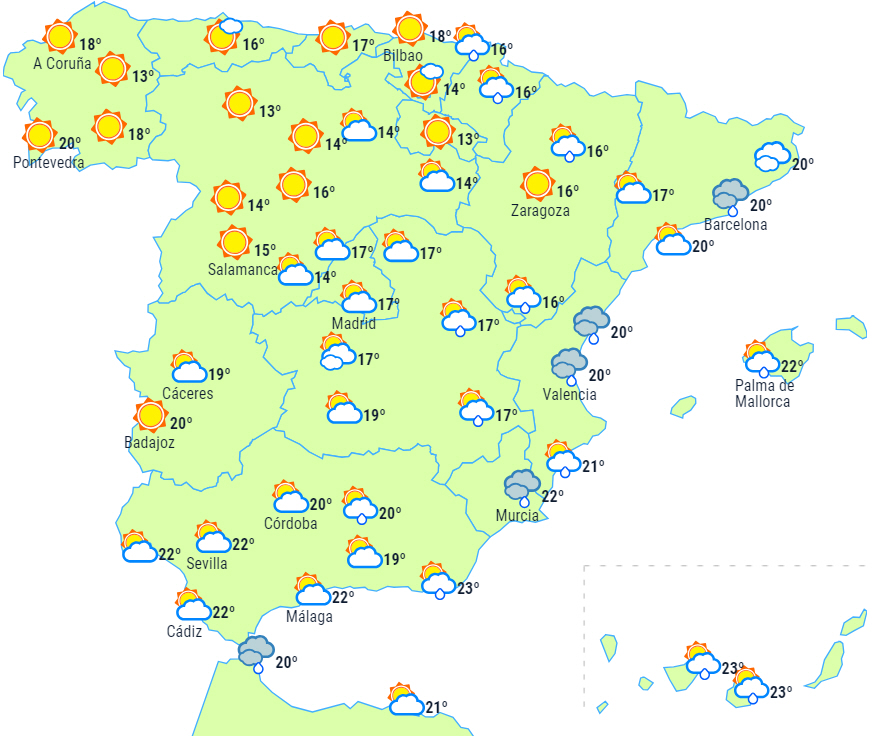 På resten af halvøen forventes lavthængende skyer om morgenen over den nordvestlige og cantabriske del, men det har tendens til at klare nogenlunde op og senere blive erstattet af mellem- og højtliggende skyer, der kommer ind fra sydvest, og det kan kaste noget svag og spredt regn af sig i det vestlige Andalusien og Extremadura.