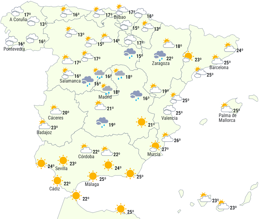 - Nedbør med sandsynlighed for at være vedvarende og lokalt kraftig i Galicien. Bemærkelsesværdigt fald i nattemperaturerne i det nordlige indland af fastlandet og lokale fald om dagen i Cantabrien.