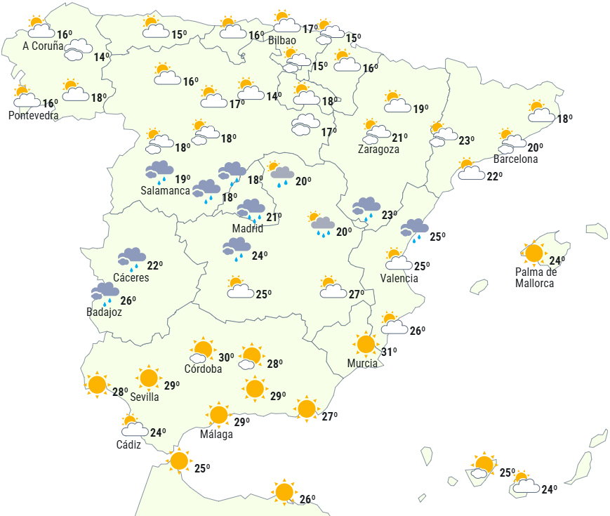 Fronten giver nedbør i løbet af dagens første halvdel til den nordlige halvdel af Den Iberiske Halvø, mens det bør holde tørt i den østlige ende, såvel som i området omkring det sydlige højland. I dagens anden halvdel vil regnen være begrænset til lejlighedsvis forekomst i de helt nordlige og vestlige dele af halvøen.