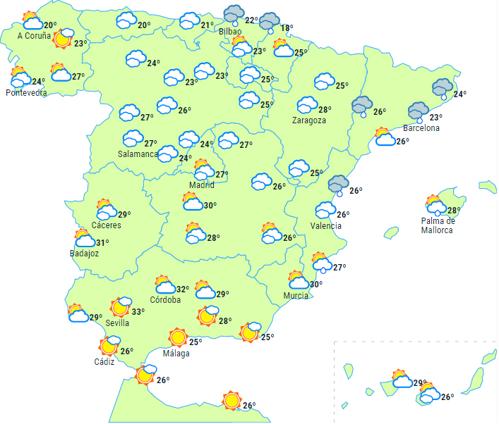Perioder med overskyet og efterhånden tiltagende til overskyet i Galicien og Cantabrien med sandsynlighed for lette byger i løbet af dagen. Skyerne vil også gradvis samle sig over den østlige tredjedel af halvøen og Balearerne med sandsynlighed for byger og tordenvejr - især i den nordlige del af Aragón, Catalonien og Valencia, hvor der lokalt kan forekomme kraftige byger og tordenvejr.