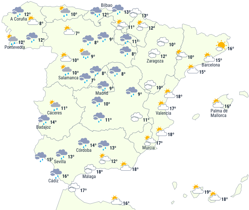 Der forventes en form for overgangsdag mellem passagen af fronter forbundet med Garoé-stormen og ankomsten af en ny front forbundet med Éowyn-stormen. Således forventes klar himmel langs Middelhavskysten og på Balearerne og overskyet himmel i resten af landet. I den vestlige del af Galicien vil tilnærmelsen til en front give nedbør, der har tendens til at tage til i løbet af dagen, så den kan være kraftig og/eller vedvarende i den vestlige halvdel og kan brede sig til andre områder i nordvest.
