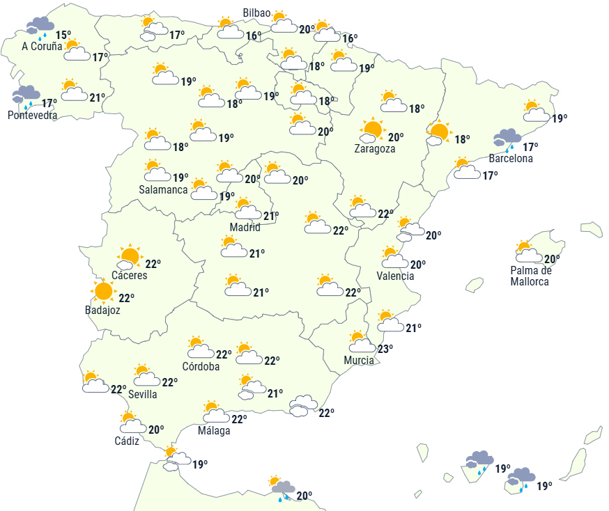 Vejret forventes generelt at være stabilt på Den Iberiske Halvø og De Baleariske Øer. Dog vil en dana (isoleret lavtryk) nærme sig fra den sydlige del af halvøen og give skyet himmel med mellem- og højtliggende skyer samt mulighed for enkelte svage og spredte byger ved Alborán og på den sydøstlige del af halvøen.