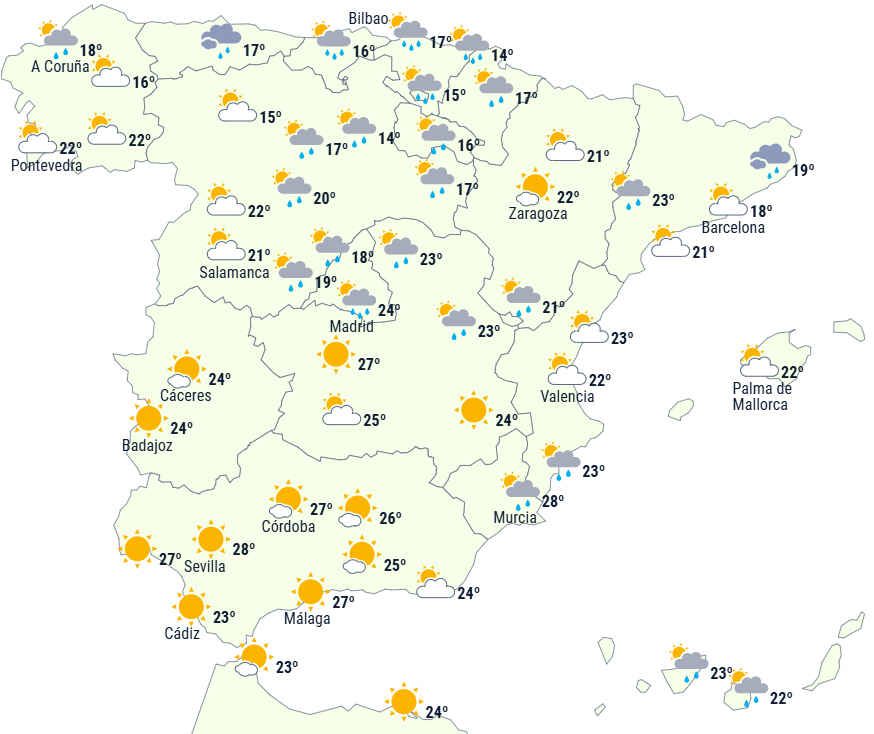 På nær den nordøstlige tredjedel forventes der udvikling skyer i det indre af halvøen med byger ledsaget af lejlighedsvise tordenbyger i de største bjergområder, men det er også muligt i det nordlige højland. Disse vil være mest intense og udbredte i nordvest, hvor de lokalt kan blive kraftige i bjergene i Galicien eller det vestlige Cantábrico.