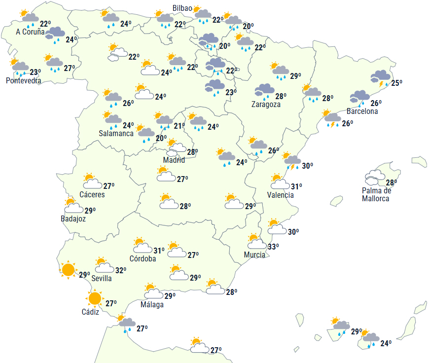 Der forventes fra starten af dagen rigeligt med mellem- og højtliggende skydække ved Alborán, den østlige halvdel af Den Iberiske Halvø og De Baleariske Øer, og skyerne bevæger sig fra syd mod nord og giver mulighed for regn- og tordenbyger - mest sandsynligt på den nordøstlige og østlige del om eftermiddagen.
