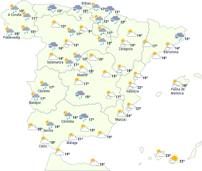 Dagen vil være præget af passagen af en koldfront over Den Iberiske Halvø og De Baleariske Øer, hvilket giver overvejende overskyet himmel og svag nedbør til det meste af Den Iberiske Halvø, og det når sandsynligvis også De Baleariske Øer mod slutningen af dagen.