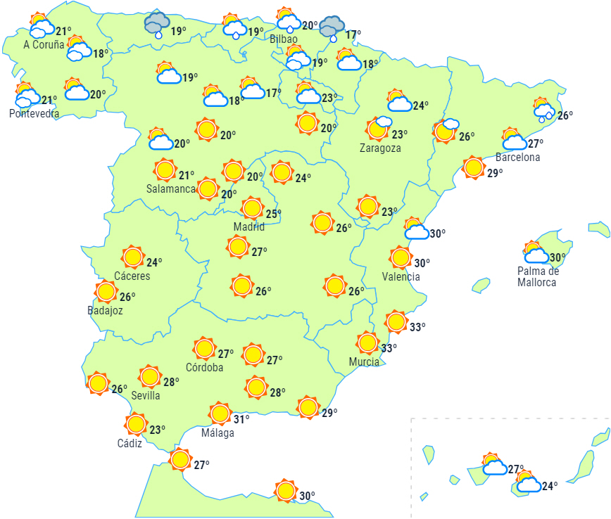 Der forventes dog skyet himmel over det cantabriske område og det nordlige Galicien, og det kan give let nedbør, der har tendens til at aftage ved kysterne om eftermiddagen.