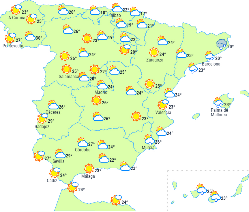 Fortsat ustabilt vejr på halvøen og Balearerne med skyet vejr og mere overskyet i dagens anden halvdel. Der er sandsynlighed for byger og tordenvejr i store dele af de indre egne i syd, halvøens centrale egne og lokalt kraftigt uvejr til de førnævnte områder.