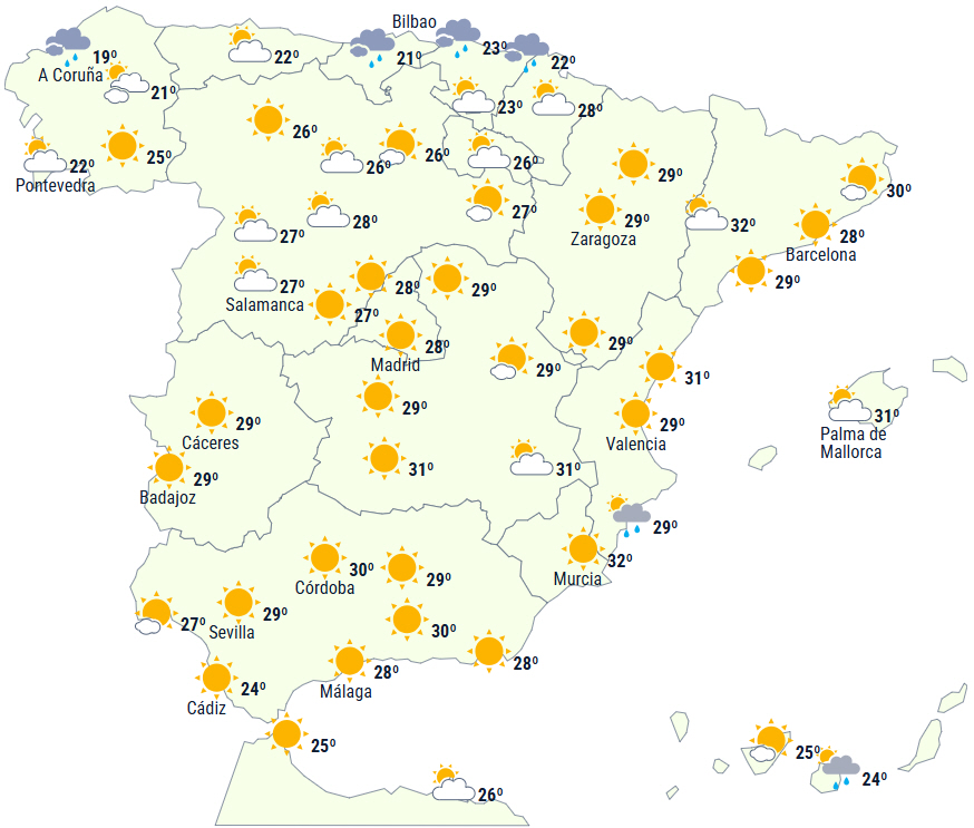 I det nordlige Galicien og Cantabrien vil der være rigeligt med skyer med nedbør, der bevæger sig fra vest til øst. Ligeledes vil der dannes flere skyer i bjergene på den yderste nordlige og østlige halvdel af halvøen samt på De Baleariske Øer, og det giver mulighed for spredte regn- eller tordenbyger, mest sandsynligt i den helt nordlige del.