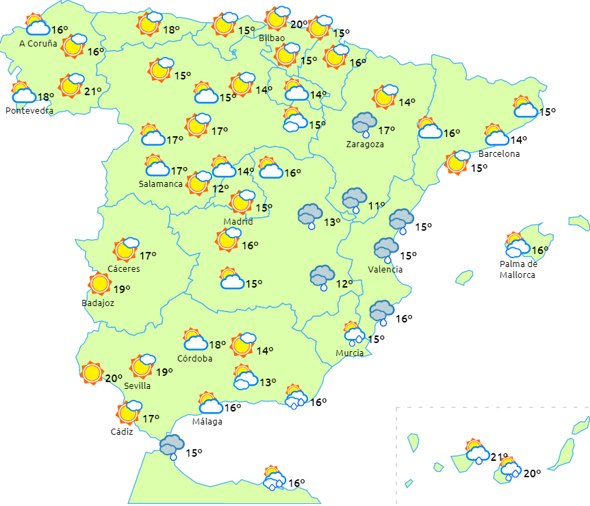 Ved Gibraltarstrædet og Melilla er der også overskyet med spredt og lejlighedsvis nedbør. Skyet himmel over den sydøstlige del af halvøen med enkelte byger i eftermiddag.