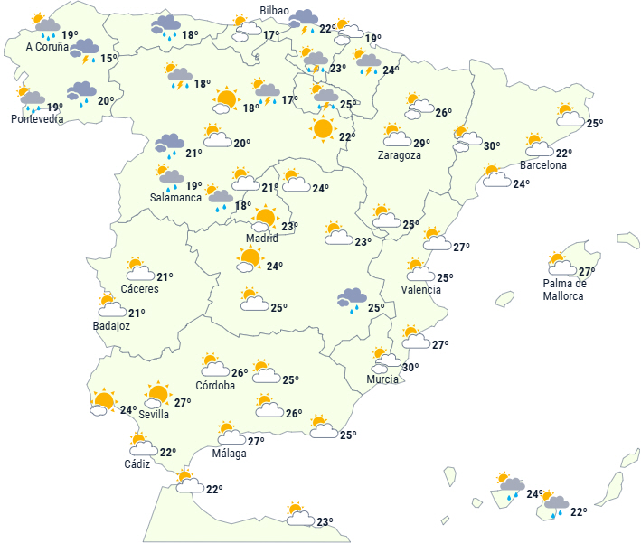 Kun på den nordligste del af Den Iberiske Halvø vil der være overskyet himmel med svage og spredte byger ved den cantabriske kyst, som om eftermiddagen vil bevæge sig ind over landet.