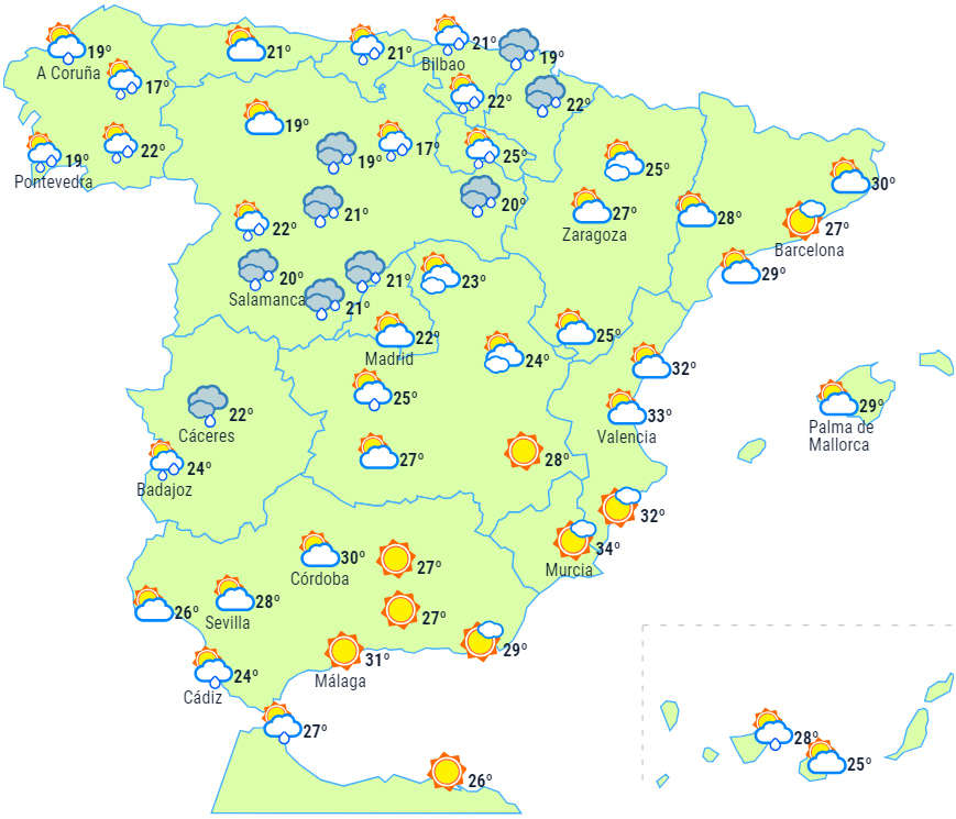 Passagen af en ret aktiv Atlanterhavsfront forventes at give overskyet himmel og udbredt nedbør til halvøen, der strækker sig over den nordvestlige halvdel, men mest på den nordvestlige tredjedel og i Pyrenæerne, hvor der også kan komme tordenvejr. Lokalt heldagsregn - muligvis kraftig - i områder i Galicien, Asturien, León, Sanabria og Pyrenæerne og måske også de tidligere nævnte bjerge.