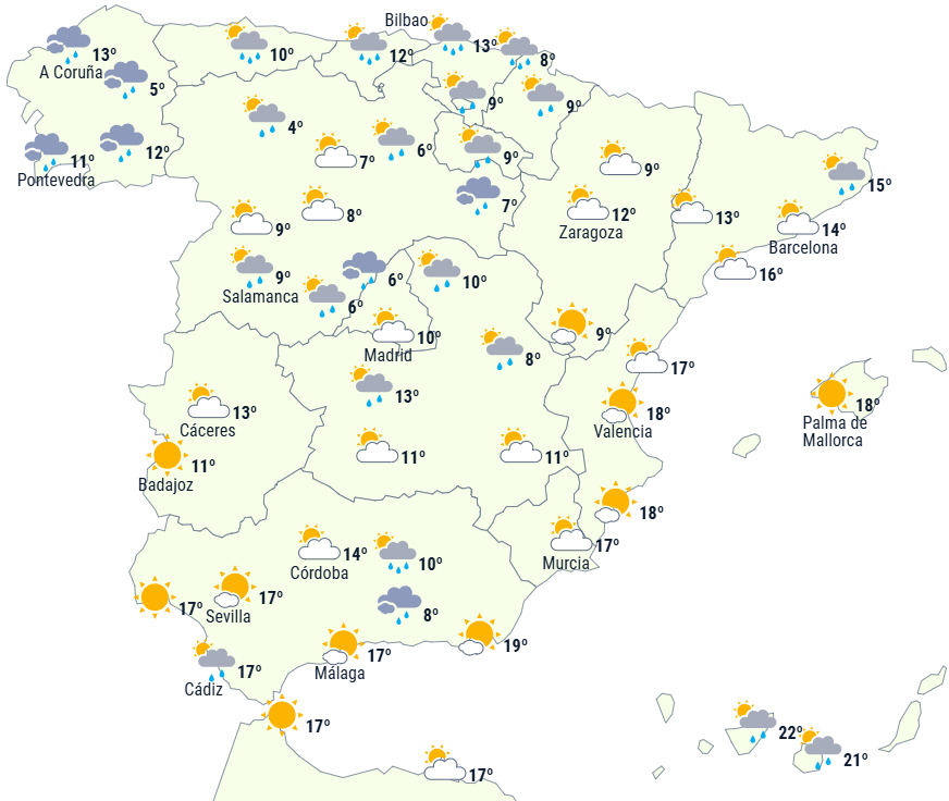 En koldfront, der er forbundet med Herminia-stormen, vil krydse halvøen i løbet af dagen og nå Middelhavet og De Baleariske Øer sidst på dagen.