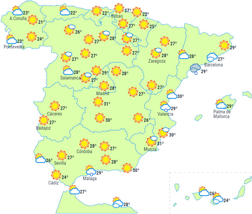 Det meste af landet vil have letskyet himmel, men over Galicien, ved Det Cantabriske Hav, over det østlige Spanien og De Baleariske Øer forventes der overskyet i perioder om morgenen, som i det sydøstlige indland og på Valencias kyst kan give nogle byger.