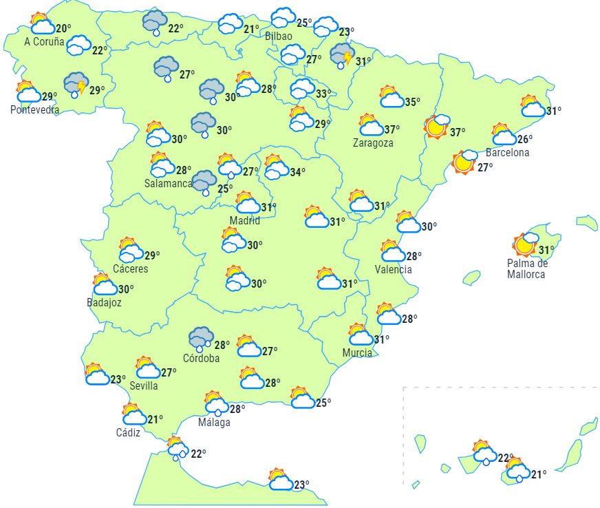 Maksimumstemperaturerne vil falde på den sydlige halvdel, det nordlige Galicien, ved Det Cantabriske Hav, det nordlige højland og i de indre egne på De Kanariske Øer, mens de vil stige på Balearerne, i den nordøstlige del af fastlandet og i Rías Baixas. Vi kan nå op på 34 til 36 grader i Ebro-dalen og de nordøstlige dale.