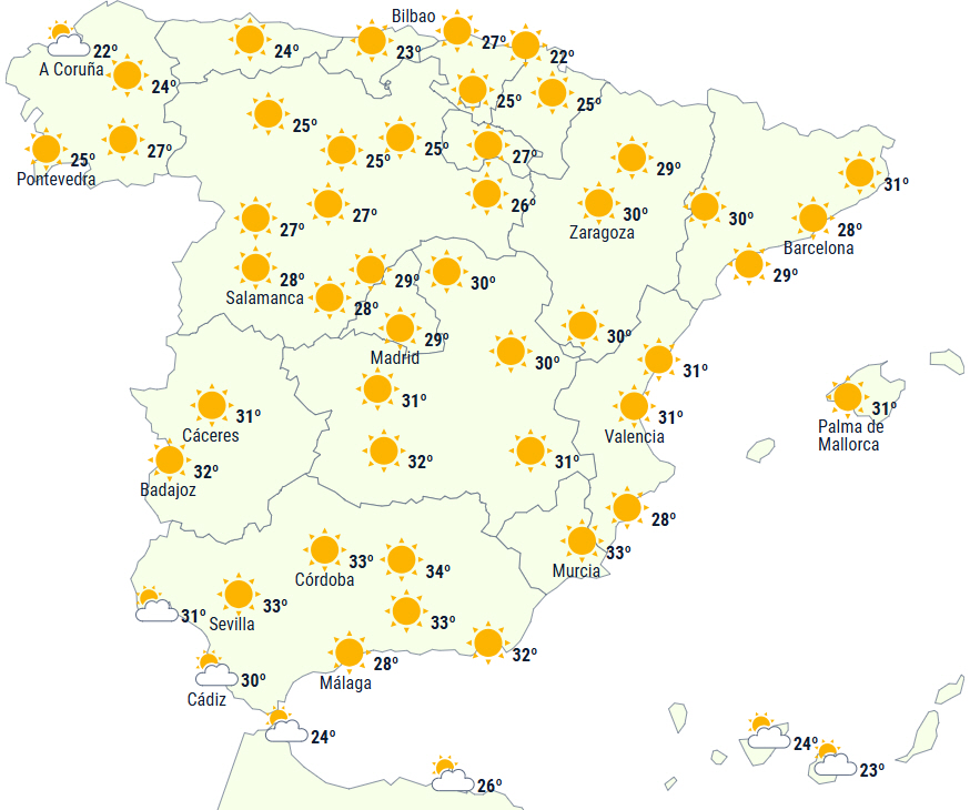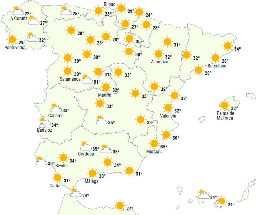 I dag forventes stabilt vejr med letskyet himmel, bortset fra i Cantabrien og Galicien, hvor det forbliver skyet med enkelte svage byger i indlandet, og de kan ikke udelukkes i bjergområderne i det sydøstlige af fastlandet.