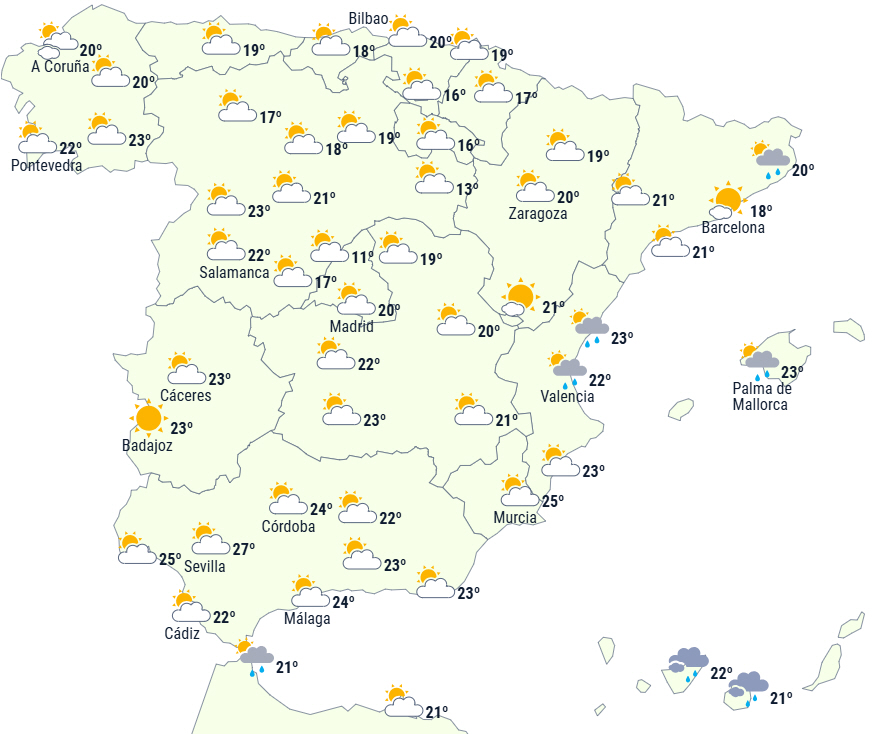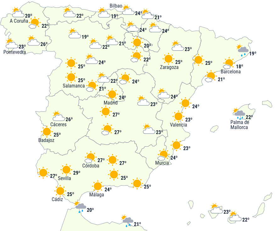 På Den Iberiske Halvøs nordøstlige del og De Baleariske Øer forventes flere skyer om eftermiddagen med mulighed for enkelte, lokale byger.