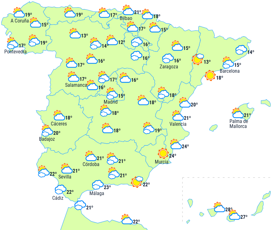 Et højtryk forventes at herske over halvøen og Balearerne i dag med overvejende letskyet eller klar himmel. Kun i den helt vestlige del af halvøen vil en front forårsage tiltagende skydække sidst på dagen. Der vil også være lavthængende skyer med morgendis og tåge i højlandet, Ebro-dalen, de nordøstlige dale, på Balearerne og den sydøstlige del af halvøen.