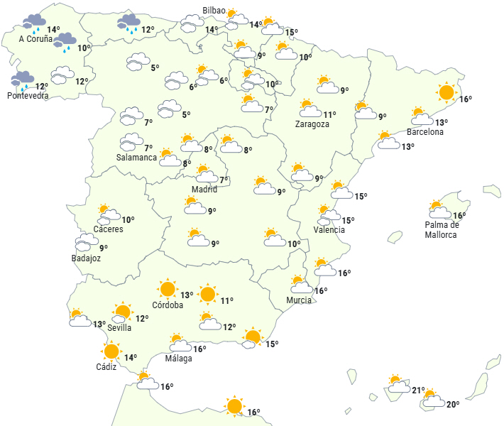 Det forventes, at stabiliteten fortsætter på størstedelen af Den Iberiske Halvø med overvejende klar himmel, bortset fra i nord, hvor der vil være skydække og mulighed for lejlighedsvis svag regn - særligt i slutningen af dagen i det vestlige Galicien.