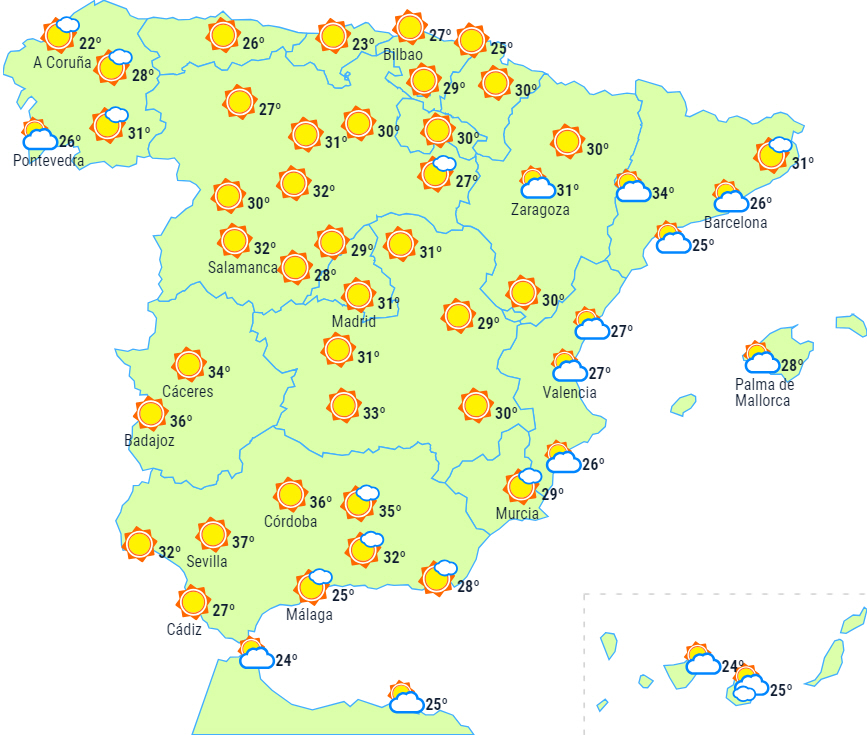 Stabilt vejr på halvøen og Balearerne med stort set ingen eller kun højtliggende skyer, men der vil også være spredte lavthængende skyer om morgenen i Middelhavsområdet.