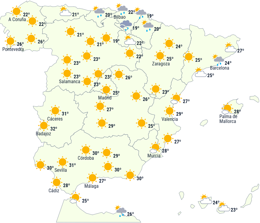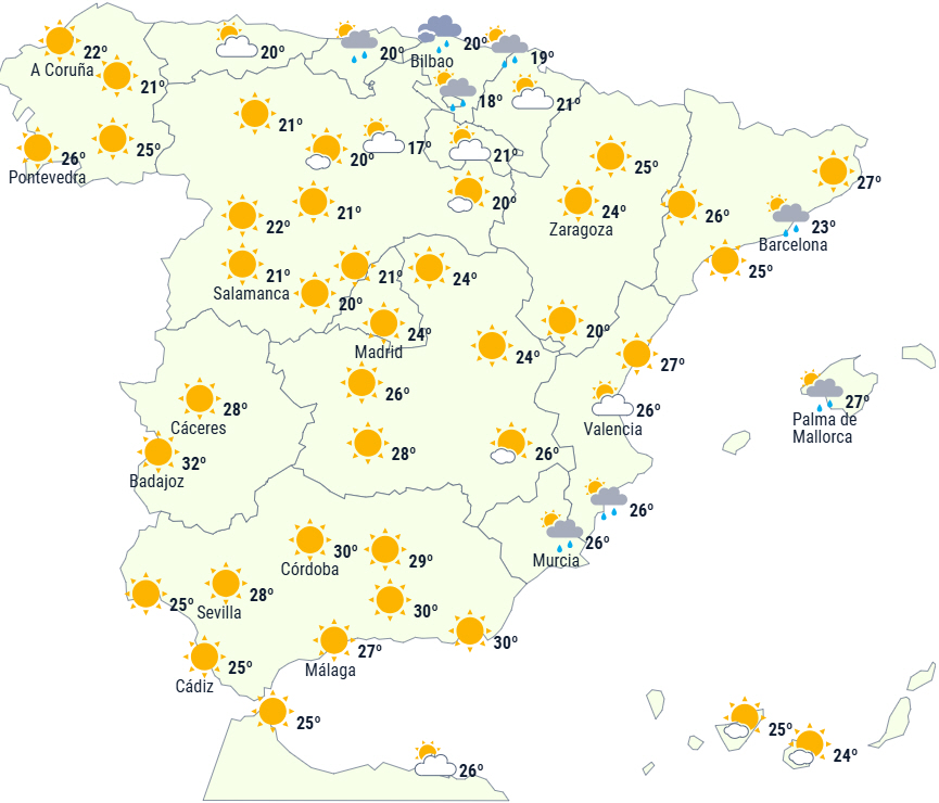 Der forventes stabilt højtryksvejr i næsten hele landet, med overvejende letskyet eller klar himmel og perioder med lavthængende skyer i Cantábrico og de nordlige dele af De Kanariske Øer.