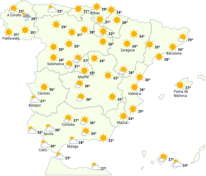 Dermed forventes vi at overstige 34 til 36 grader på det meste af den sydlige halvdel af Den Iberiske Halvø og i det nordøstlige indland, samt i områder af det nordlige højland og endda lokalt i dalområder i nordvest. Der er sandsynlighed for at overstige 38 og endda 40 grader i Guadalquivir-området samt på enkelte steder i Guadiana og de nordøstlige dale. På De Kanariske Øer forventes ingen ændringer.