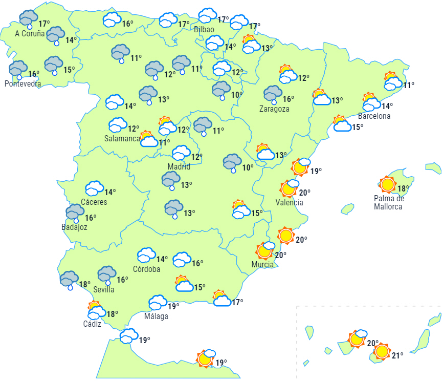 Halvøen forventes at være under indflydelse af et lavtryk, som giver overvejende skyet eller overskyet himmel og let nedbør, der påvirker de atlantiske og cantabriske områder, såvel som området omkring den øvre Ebro-dal og Pyrenæerne, hvor nedbøren falder som sne. Sidst på dagen vil nedbøren have tendens til at intensivere i nordvest.