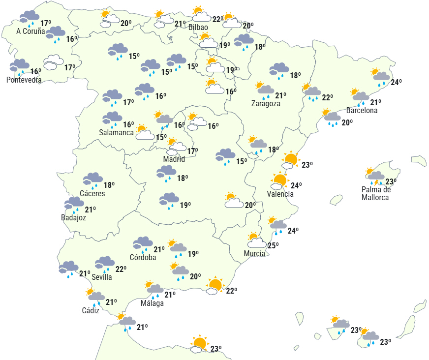 Et lavtryk over den sydvestlige del af Den Iberiske Halvø giver ustabilt vejr med overskyet eller letskyet himmel over halvøen og De Baleariske Øer med udbredt nedbør i den vestlige halvdel af fastlandet og noget mere spredt i centrum og nordøst. Der forventes heldagsregn i det sydvestlige Castilla y León, Extremadura, Sistema Central, det vestlige Castilla-La Mancha og vestlige Andalusien, samt på de sydlige andalusiske kyster om eftermiddagen.