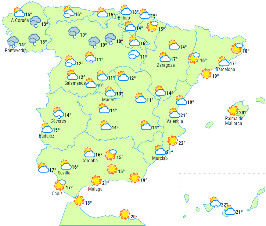 På halvøen og De Baleariske Øer forventes en overgang til mere stabilt vejr efter passagen af en front. På halvøens Atlanterhavsside og i Pyrenæerne forventes der mange lavthængende morgenskyer med let regn i Galicien, i den vestlige del af de centrale bjerge og det nordligste højland. Der kan også komme lidt spredte og lejlighedsvise byger i nærliggende områder, men det har generelt tendens til at klare op og aftage ret hurtigt.