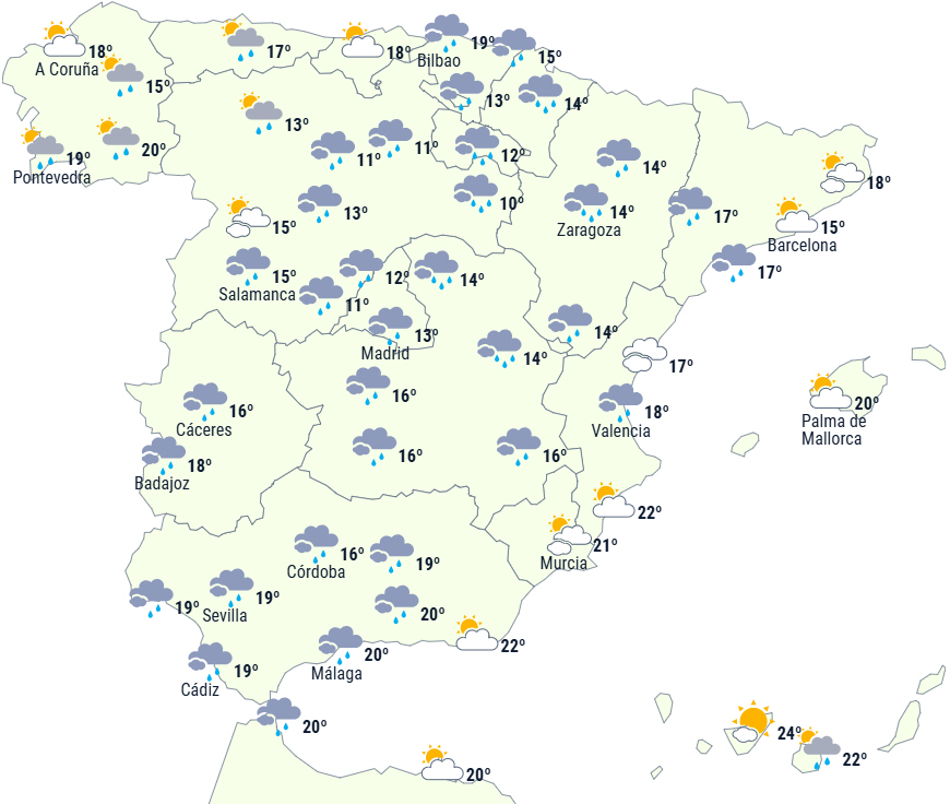 Ustabilt vejr, der Atlanterhavsstormen Nuria nærmer sig Den Iberiske Halvø og placerer sig sydvest for Cabo San Vicente. Der vil således overvejende være skyet eller overskyet vejr med næsten udbredt nedbør, mindre sandsynligt og i hvert fald mere spredt i de nordøstlige og sydøstlige egne af halvøen, og det forventes ikke at nå De Baleariske Øer, hvor der kun vil være perioder med højtliggende skyer.