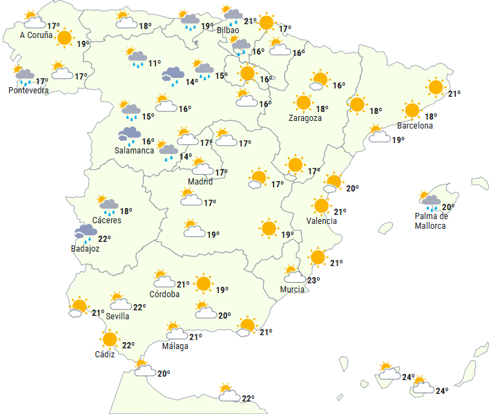 Der forventes stabilt vejr på størstedelen af Den Iberiske Halvø, med klar eller skyfri himmel. Dog vil fugtig vind fra Middelhavet give overskyet himmel eller perioder med det helt i nordøst og sydøst samt på De Baleariske Øer. Det skaber sandsynlighed for lejlighedsvise byger, der påvirker øerne og kysterne i Catalonien, men det kan heller ikke udelukkes i den sydlige del af Valencia Regionen, Murcia og Almería.
