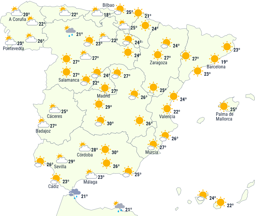 Da et lavtryk fra Atlanten nærmer sig Den Iberiske Halvø, vil himlen være overskyet over den vestlige tredjedel med nedbør, der bliver kraftigere i dagens anden halvdel. Generelt vil nedbøren være svag, men til tider moderat eller kraftig og med torden og mere kraftig i det nordlige indland af Galicien.