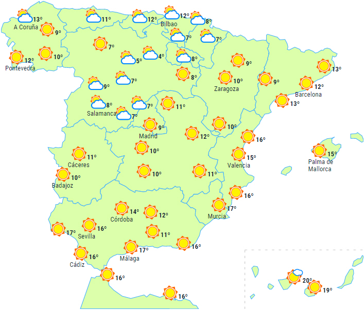 Dagstemperaturerne stiger på halvøen og Balearerne, mens nattemperaturerne stiger i Gibraltarstrædet og på Balearerne og falder på den nordlige halvdel af fastlandet. Kun få ændringer i resten af landet. Udbredt frost i det indre af halvøen og tung frost i Pyrenæerne og lokalt også i visse andre bjergsystemer på den nordlige del af halvøen.