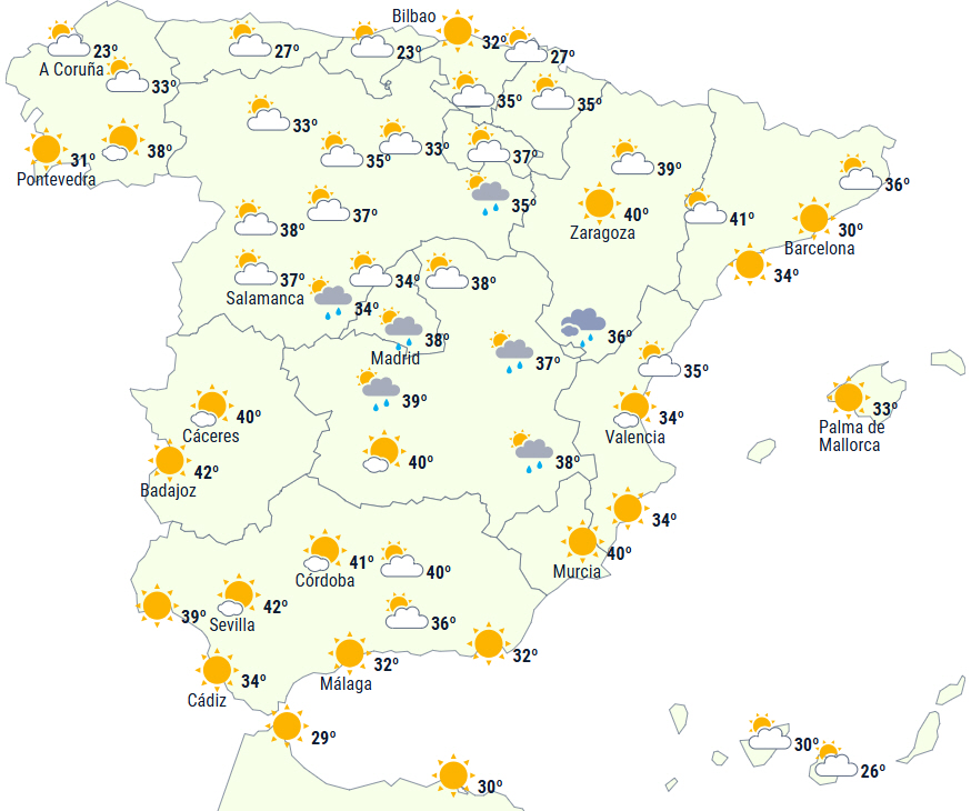 Dagstemperaturerne er i let stigning på den nordøstlige del af Den Iberiske Halvø, den nordlige middelhavskyst og De Baleariske Øer, dog mere markante stigninger i det østlige Cantabrien, mens der i resten af Den Iberiske Halvø og De Kanariske Øer ventes lette fald, som vil være tydelige på den nordvestlige kyst af Galicien. Alligevel forbliver niveauerne som nævnt ualmindeligt høje.