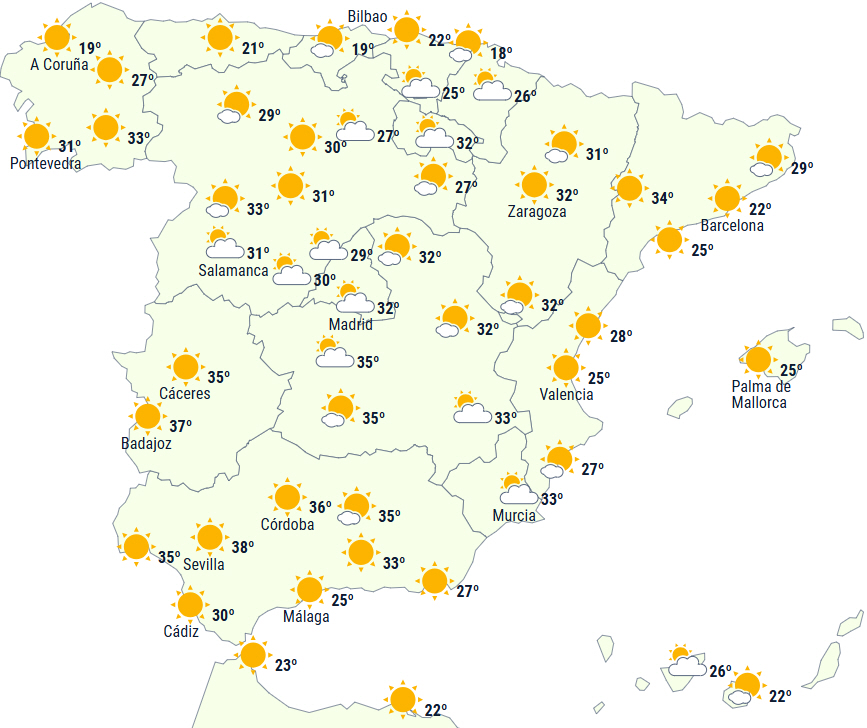 Der vil overvejende være letskyet eller perioder med mellem- og højtliggende skyer, der bevæger sig fra sydvest til nordøst, samt lavtliggende skyer i Galicien og det vestlige Cantabrien.
