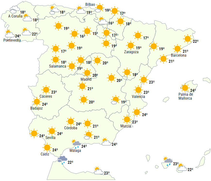 Perioder med skyet himmel, og vi kan ikke udelukke svage og lejlighedsvis byger - mere sandsynlige og intense i bjergkæderne om eftermiddagen. Temperaturer uden ændringer ved kysten, men lette fald i indlandet. Nattemperaturerne er også i let fald her og der. Dermed lander vi på 24 til 26 grader og 14 til 20 om natten.
