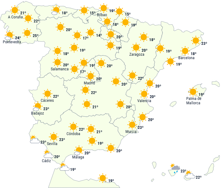 Der vil fortsat være generelt stabilt vejr på Den Iberiske Halvø og De Baleariske Øer, der er under indflydelse af et højtryk centreret nord for halvøen.