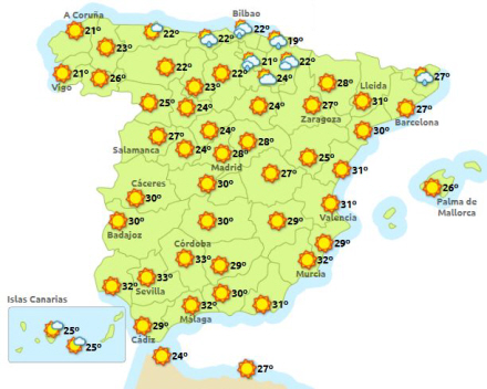 I Baskerlandet og Asturien er det ret overskyet, og der kommer byger. I Catalonien og på Balearerne vekslende skydække og også mulighed for byger. Den nordlige del af De Kanariske Øer får skyet vejr, men det skulle holde tørt. I resten af landet letskyet eller skyfrit.
