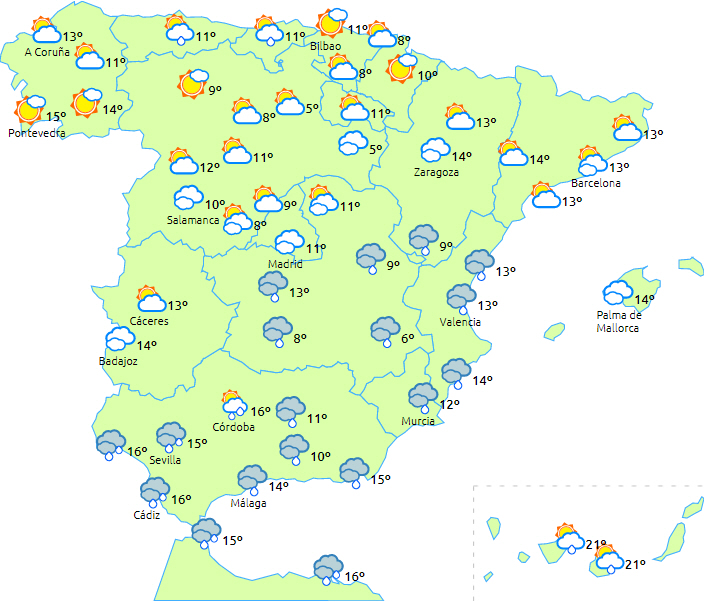 I dag varsles der om lokalt kraftig nedbør ved Gibraltarstrædet og Melilla og tidligt om morgenen også på De Kanariske Øer. Det ventes igen betydelige snefald til den sydøstlige del af halvøen.