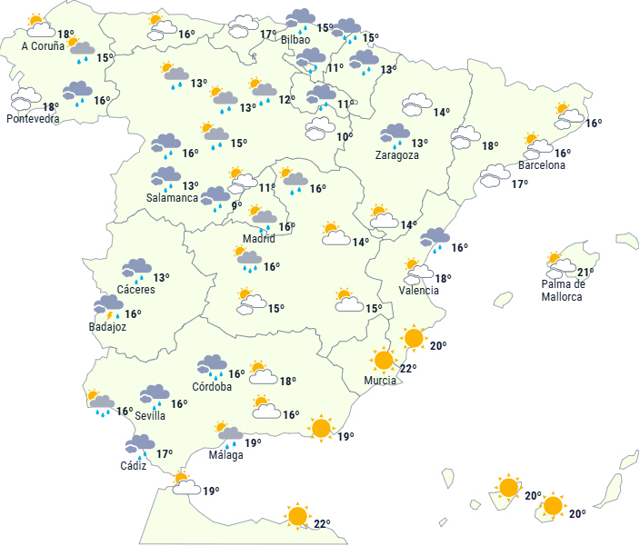 Dagstemperaturerne stiger på De Kanariske Øer og på det meste af den østlige halvdel af halvøen, mens de forbliver uændrede i resten af landet.