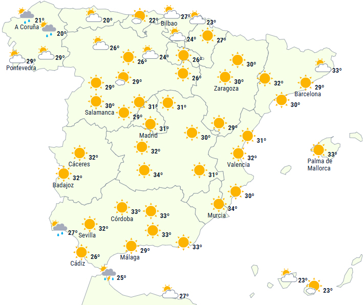 - Dagstemperaturerne er meget høje i den sydlige del af det nordlige højland, på den nordøstlige del af halvøen og i den sydlige halvdel, hvor der forventes 34 til 36 grader eller højere. I midterste del af floddalene Tajo, Guadiana og Guadalquivir kan temperaturen overstige 40 grader.