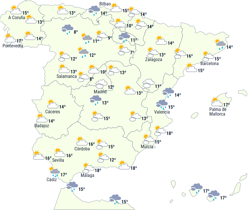 I dag fortsætter det ustabile vejr på den østlige del af Den Iberiske Halvø med overskyet himmel, der dog gradvis klarer op fra vest. Nedbør vil hovedsageligt påvirke den østlige del af halvøen og kan igen være kraftig og/eller vedvarende i Valencia og Castellón.