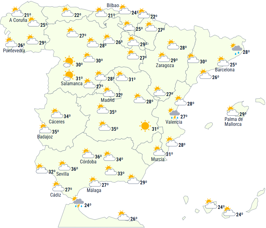Dagstemperaturerne kan overstige 35 grader i Guadalquivir og sydøstlige dale, mens nattemperaturerne ikke falder til under 20 grader i Middelhavsområdet og Guadalquivir.