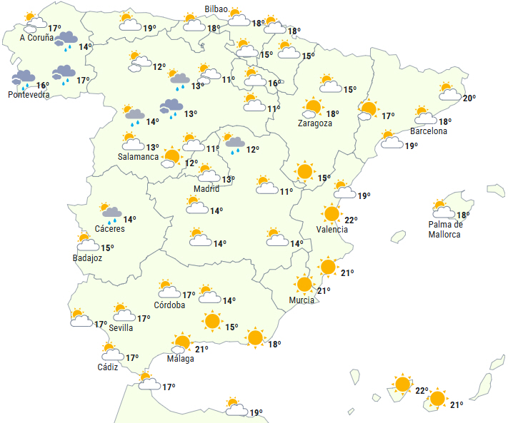 Det forventes, at vejret på Den Iberiske Halvø og De Baleariske Øer fortsat vil være præget af flere fronter, der passerer forbi og giver overvejende skyet eller overskyet himmel, dog er der tendens til, at det klarer op i Middelhavsområdet og på sydvestlige del af halvøen i løbet af dagen.
