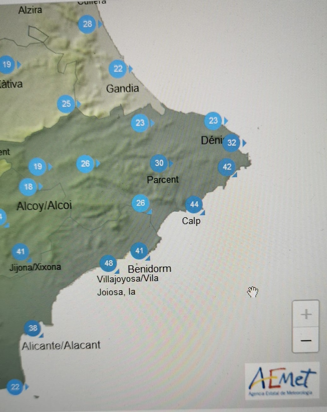 Kraftig vind eller meget kraftige vindstød i Pyrenæerne, Ampurdán, Balearerne, den nedre Ebro-dal, Valencia og Melilla. Betydelige temperaturfald til det meste af halvøen med markante temperaturfald i Pyrenæerne.