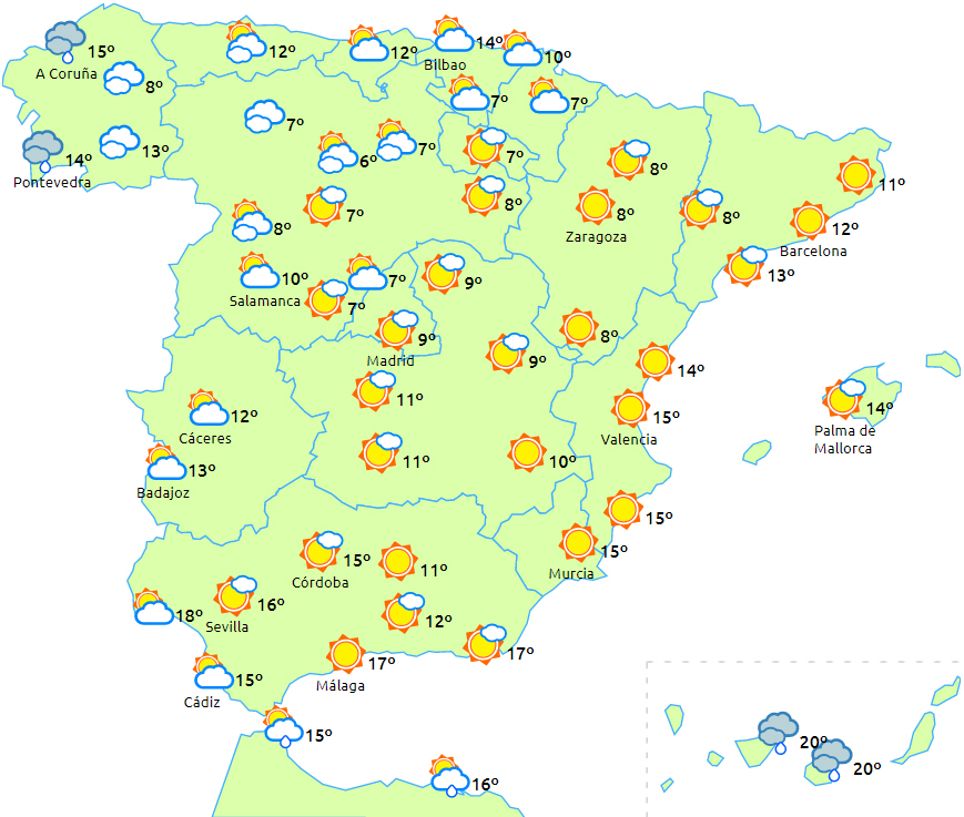 Temperaturerne falder i hele landet med betydelige fald i de højtliggende egne på den nordlige og østlige halvdel af halvøen. Nattemperaturerne falder betydeligt i Pyrenæerne. Der forventes frost i og omkring bjergområderne på halvøen.