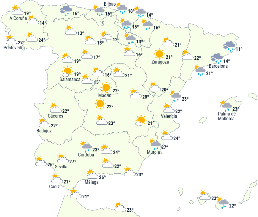 På Den Iberiske Halvø og De Baleariske Øer vil en ny Atlanterhavsfront nærme sig og trænge ind over det nordlige område, og det betyder udbredt skydække og sandsynlighed for nedbør, der spreder sig sydpå.