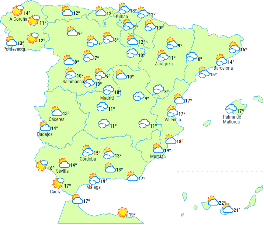 En front forventes at krydse halvøen fra vest mod øst, hvilket giver mange mellem- og højtliggende skyer. Skyerne vil sandsynligvis efterhånden aftage mod vest, men vil så tage til igen i den vestlige del af Galicien, hvor det bliver skyet eller overskyet, og let regn kan ikke udelukkes.