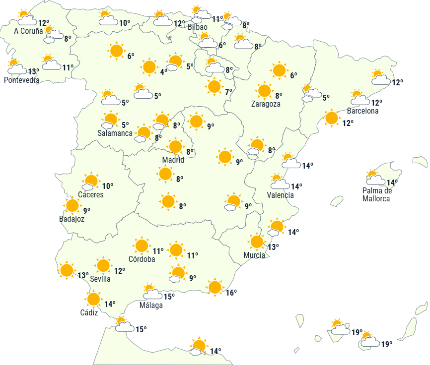 Frost vil fortsat påvirke store dele af det indre af det nordlige Spanien, samt bjergområder i sydøst og østlige dele af den sydlige højslette. Svag frost kan også forekomme på Mallorca.