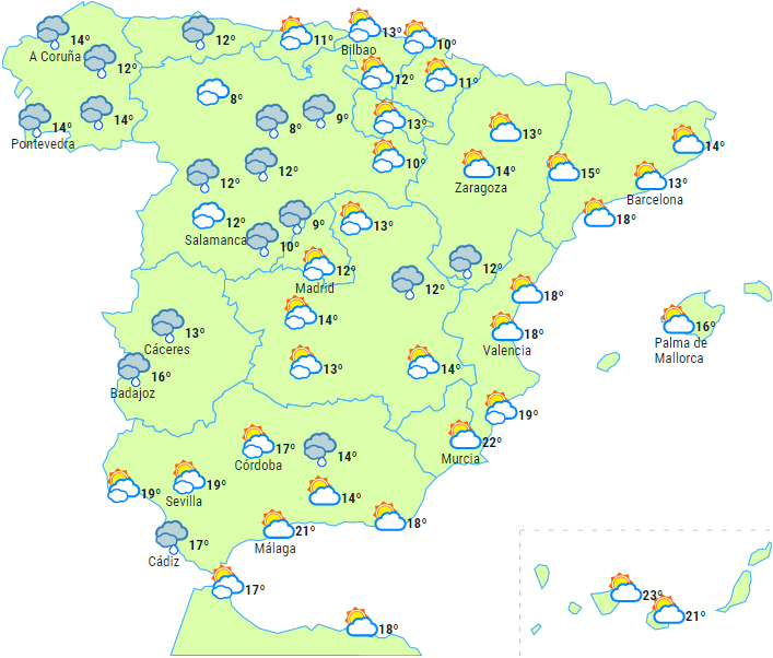 På Balearerne og en stor del af den østlige del af halvøens indre er der større sandsynlighed for byger i dagens første halvdel.